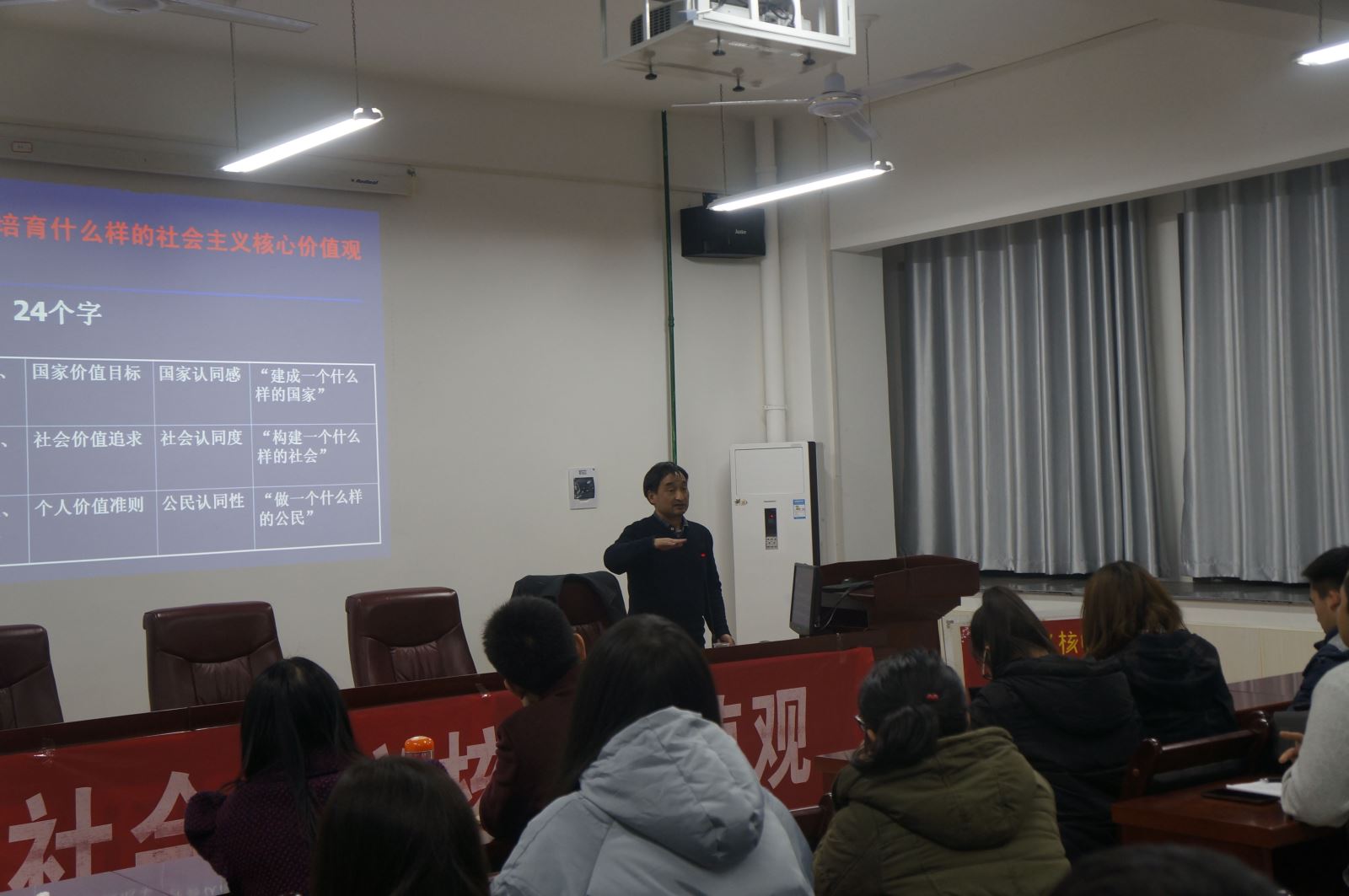 曾曙林围绕主题从国家、社会、个人三个层次进行阐述。首先,曾曙林从我国社会主义发展历程出发,结合全球化格局带来的影响,对我国社会主义发展现状进行解析。他认为,社会主义意识形态面临着异常复杂的新考验、新挑战和新影响,高校教师要正确引导大学生践行社会主义核心价值观。接着,曾曙林结合大量实际案例诠释社会主义核心价值观理论体系。他结合当下热点事件对社会主义核心价值观24字基本内容进行深度讲解,认为这24个字是社会主义核心价值观体系的高度凝练和集中表达。同时,他希望同学们在以后的人生道路上,能真正把社会主义核心价值观刻入脑海,不断完善与提升自己,成为一个真正对国家,社会,家庭有用的人才。