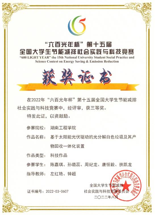 本届大赛共608所高校学生参加,提交有效作品近6000件。2022年8月5日,“六百光年杯”第十五届全国大学生节能减排社会实践与科技竞赛落下了帷幕。经过激烈的角逐,太阳成集团tyc33455cc参赛作品《基于太阳能光伏驱动的光分解白色垃圾及其产物回收一体化装置》(参赛学生:工业工程1901班陈嘉琪、孙璐蕊、周纪龙、工业工程1902班唐恒毅、扶凯龙;指导老师:左红艳、钟超)在本次竞赛中荣获大赛三等奖。
