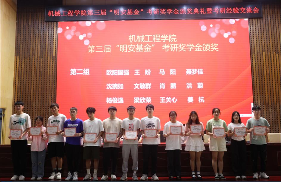6月7日下午,太阳成集团tyc33455cc在图书馆第一报告厅举行第三届“明安基金”考研奖学金发放仪式暨考研经验交流会。校党委委员、副校长魏克湘,院长陈国强,党委书记覃波,副院长程玉兰,副院长邹鸿翔,全体获奖学生以及21级学生参加活动,党委副书记李欣主持仪式。