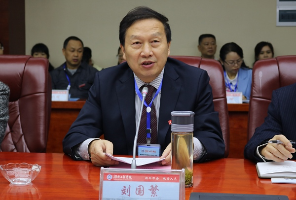 会议分两个阶段进行,第一阶段由易兵主持,校长刘国繁致辞,他在致辞中代表学校对全国工程教育专业认证专家来校考查和指导工作表示热烈欢迎和衷心感谢。他介绍了学校的基本情况,重点就我校工程教育面向行业企业、以学生为中心、以产出为导向,紧密对接市场需求进行教学模式改革的情况和取得的成绩进行了介绍。刘国繁表示,开展工程教育专业认证,有利于我们构建工程教育与行业企业的融合机制,增强我校工程教育人才培养对产业发展的适应性;有利于我们进一步推进学校工程教育改革,完善人才培养模式,进一步提高工程教育质量。他表示,此次认证对机械设计制造及其自动化专业和学校工程教育有着非同一般的意义,全校上下高度重视,全体师生将以饱满的热情、务实的工作态度认真迎接专业认证现场考查。