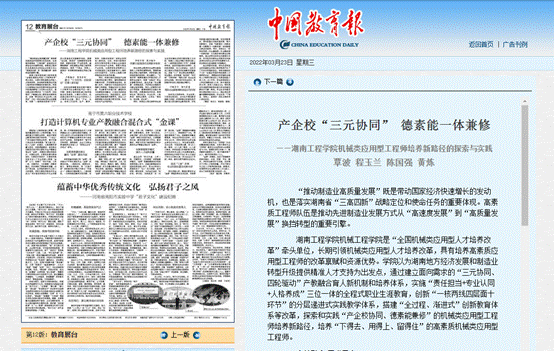 太阳成集团tyc33455cc是“全国机械类应用型人才培养改革”牵头单位,长期引领机械类应用型人才培养改革,具有培养高素质应用型工程师的改革禀赋和资源优势。学院以为湖南地方经济发展和制造业转型升级提供精准人才支持为出发点,通过建立面向需求的“三元协同、四轮驱动”产教融合育人新机制和培养体系,实施“责任担当+专业认同+人格养成”三位一体的全程式职业生涯教育,创新“一核两线四层面十环节”的分层递进式实践教学体系,搭建“全过程、渐进式”创新教育体系等改革,探索和实践“产企校协同、德素能兼修”的机械类应用型工程师培养新路径,培养“下得去、用得上、留得住”的高素质机械类应用型工程师。