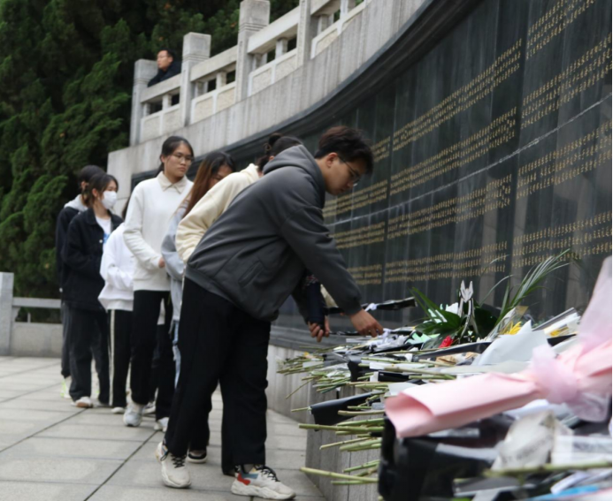 历时一个半小时的步行,师生党员于下午3点抵达湘潭烈士陵园。陵园内,庄严肃穆,在工作人员的主持带领下开始了祭扫活动。霏霏细雨中,国歌响起,师生代表向先辈敬献花篮,全体师生鞠躬默哀一分钟,深切缅怀为解放全中国、解放湘潭、抗美援朝以及社会主义建设英勇牺牲的烈士。随后,步行绕烈士纪念碑一圈,瞻仰英名墙,献上鲜花,缅怀先烈。