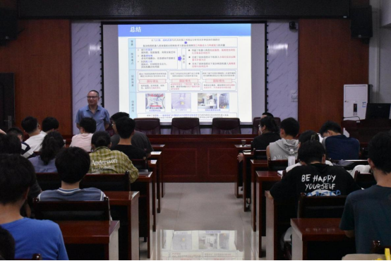 讲座开始前,陈国强讲话。他简要介绍了余桂林的求学事迹以及科研成就,佘桂林主要从事流体强扰动下薄壁结构动力学行为的研究,取得了一系列国际公认的研究成果,相关成果已被成功应用于国家核心技术领域,获得2021年度重庆市科学技术奖技术发明奖一等奖。他提议同学们以校友余桂林为榜样,在学习和科研探索过程中不断坚定理想信念,磨炼意志品质,涵养家国情怀,为国家和社会做出自己的贡献。