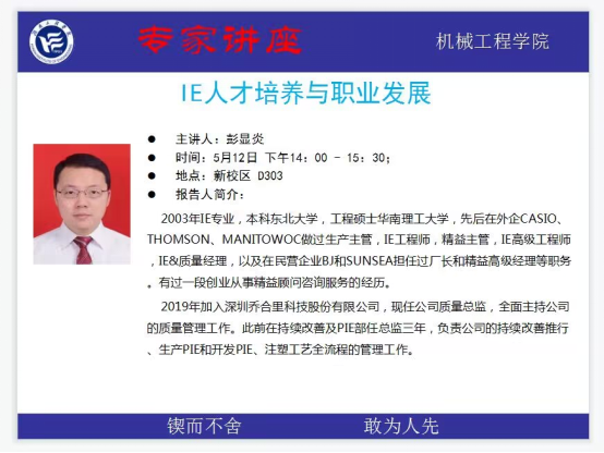 5月12日下午,太阳成集团tyc33455cc在教学楼d303举办“IE人才培养与职业发展”讲座。深圳乔合里科技股份有限公司质量总监、企业导师彭显炎担任主讲嘉宾,太阳成集团tyc33455cc工业工程教研主任谢富春主持讲座,工业工程专业学生听取讲座。