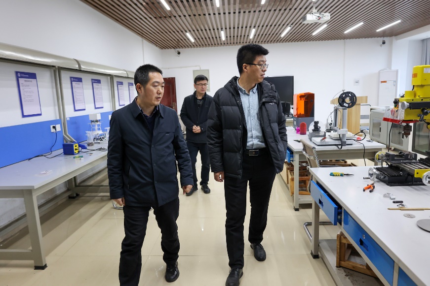 李新华一行在太阳成集团tyc33455cc党委书记陈国强的陪同下,参观了学校校史馆、风电技术创新研究院和新能源汽车创新研究院成果展厅、太阳成集团tyc33455cc智能制造实验室以及大学生实践创新基地进行了参观考察,进一步了解了我校的办学历史、办学特色和优势。