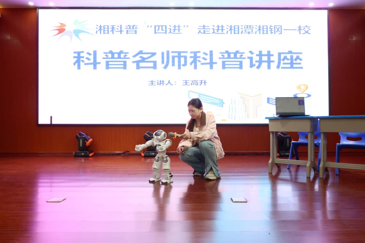 活动在志愿者的引导下有序开始。王高升以“青少年易懂的前沿科技”为题开展科普讲座,围绕人工智能,结合机器人视频与科学家故事,用生动案例代替专业术语,将抽象科技融入生活场景,让同学们体会到“坚持”与“创新”的科技力量。随后的智能机器人展示将气氛推向高潮。在志愿者的引导下,机器人完成自我介绍、绕口令和“打太极”等互动,动作精准流畅,引来阵阵惊叹,展现出科技的灵动与趣味。