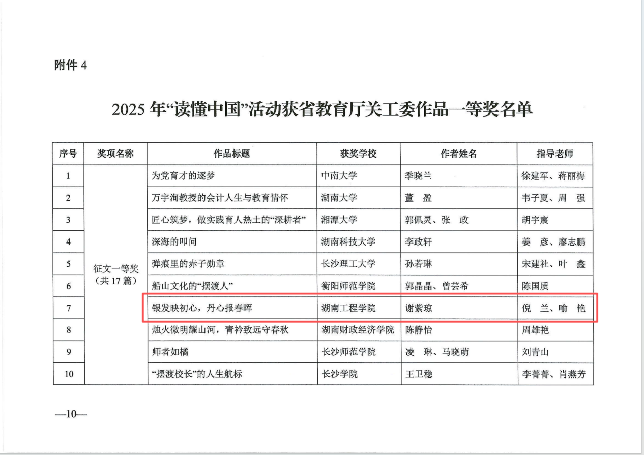 近日,中共湖南省委教育工作委员会公布了2025年全省普通高校“读懂中国”主题教育活动评审结果。由我院谢骐、倪兰、喻艳老师共同指导,谢紫琼同学撰写的征文《银发映初心,丹心报春晖》在众多参赛作品中脱颖而出,荣获湖南省教育厅关工委作品征文一等奖。