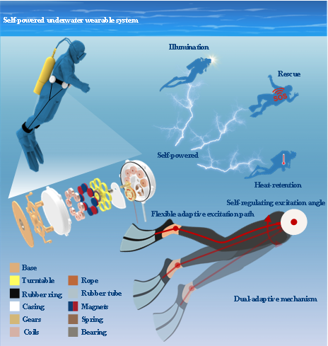 以“Adaptive underwater biomechanical energy harvesting belt”为题发表于国际能源领域权威期刊《Nano Energy》上,提出了一种自适应水下人体能量采集腰带以解决该问题。为适应复杂的水下人体运动,系统采用角度与路径双重自适应机制:自调控激励角度以使得激励方向与驱动方向一致;柔性自适应激励路径以使得不规则人体运动激励可以被有效传导,在提升能量传递效率的同时最大限度减少对潜水员运动的约束。结合单向升频转换传输机制,显著提高机电转换效率。